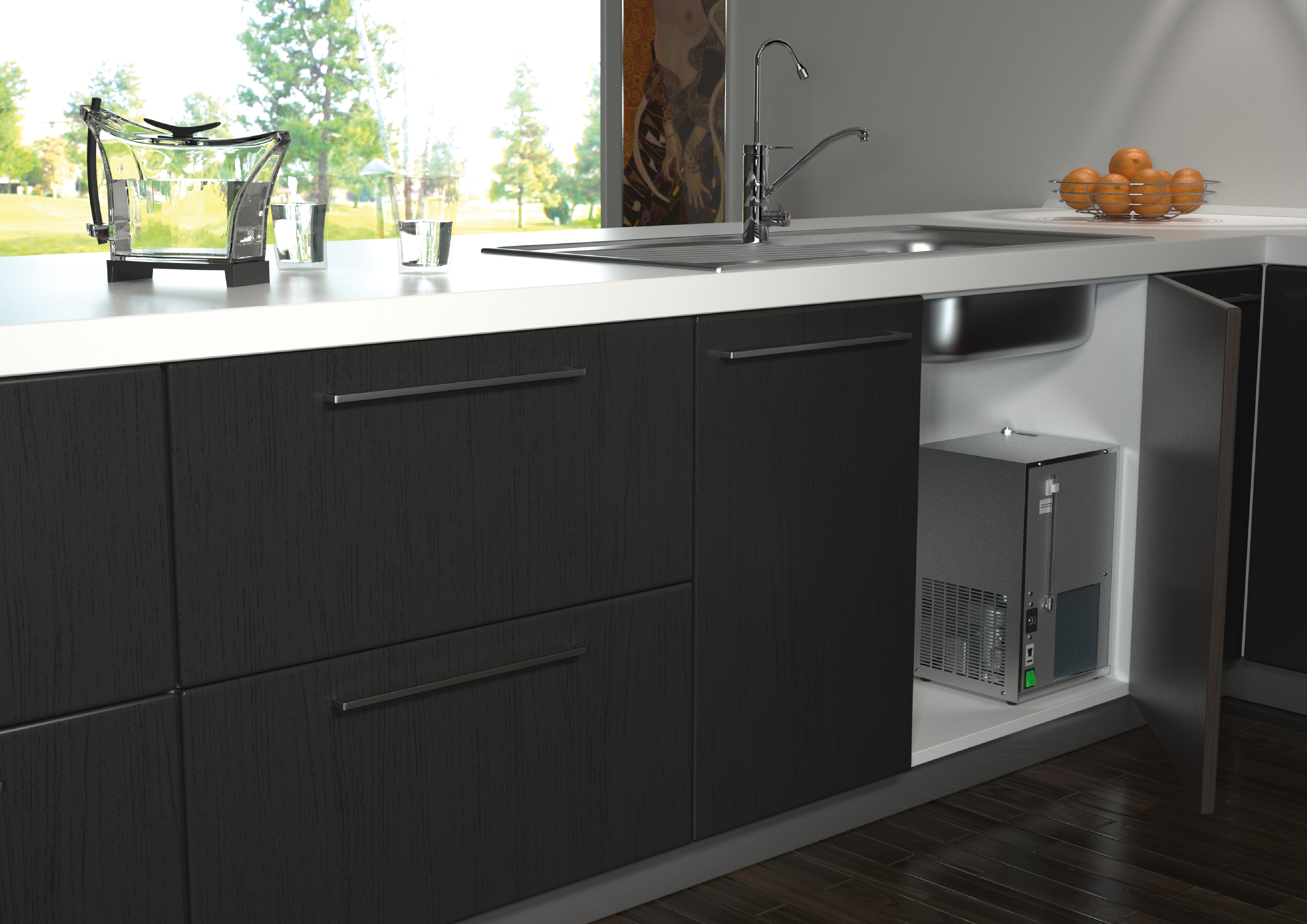 Questo tipo d'impianto è interamente racchiuso nel banco o nel sottolavello. Sia il sistema filtrante che il frigogasatore sono nascosti, l'acqua viene erogata mediante un rubinetto, che può essere laterale a quello dell'acqua di rete o unificato con lo stesso.