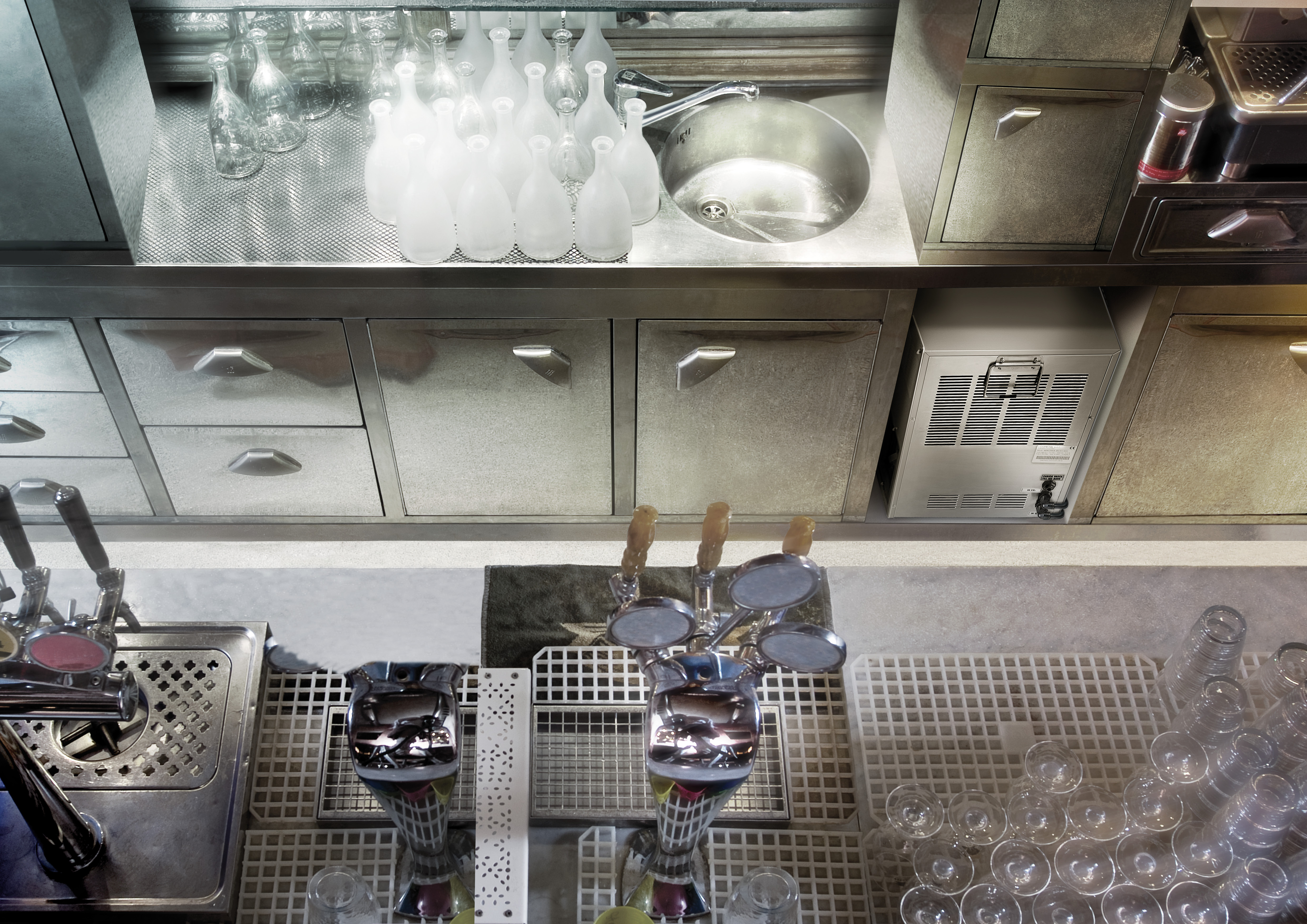 In questi tipi d'impianto il sistema filtrante e la bombola sono posizionati sotto il lavandino, mentre il frigogasatore è posizionato sopra il piano di lavoro.
